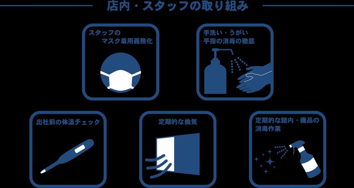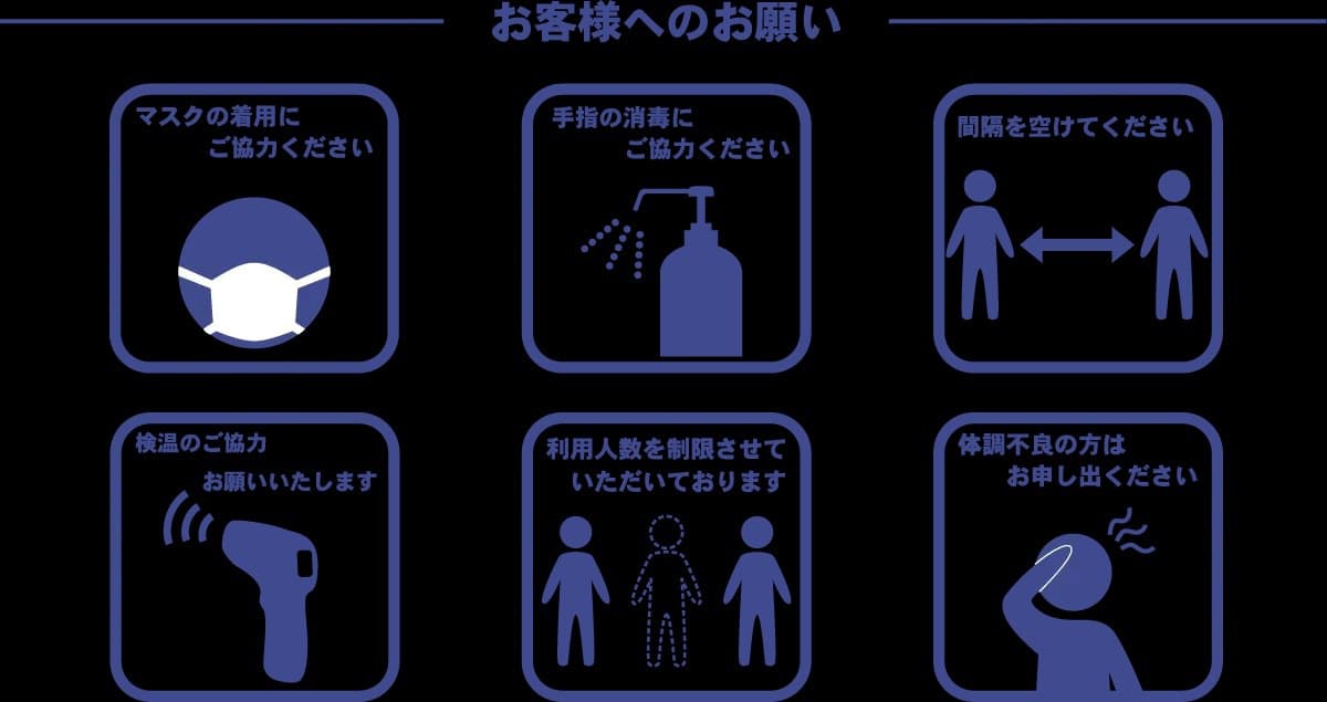 日々の営業にあたりまして、お客様はもちろんのこと、地域の皆さま、一緒に働いているスタッフたちの安全を守る為にも以下の取組を実施いたしております。また、お客さま各位におかれましても感染対策にご協力頂きますようお願い申し上げます。大変ご不便をお掛けいたしますが、ご理解とご協力を賜りますよう心よりお願い申し上げます